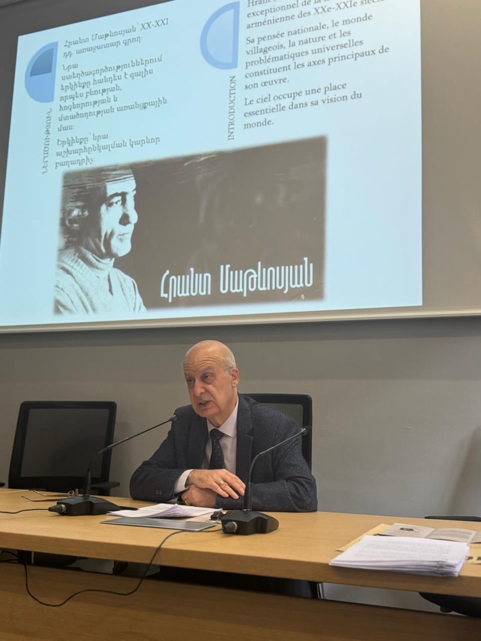 Իր ողջոյնի խօսքին մէջ դեսպան Խաչատրեան շեշտը դրաւ Հրանտ Մաթեւոսեանի ստեղծագործական ժառանգութեան համամարդկային արժէքին կարեւորութեան վրայ՝ ընդգծելով, որ գրողին լեզուամտածողութիւնն ու աշխարհընկալումը կը շարունակեն ներշնչման աղբիւր հանդիսանալ նոր սերունդներուն համար։ Դեսպանը շնորհակալութիւն յայտնեց INALCO-ին եւ գործընկեր կառոյցներուն՝ հայ գրականութիւնը արժեւորելու եւ միջազգային գիտակրթական հարթակներու վրայ ներկայացնելու կարեւոր նախաձեռնութեան համար։