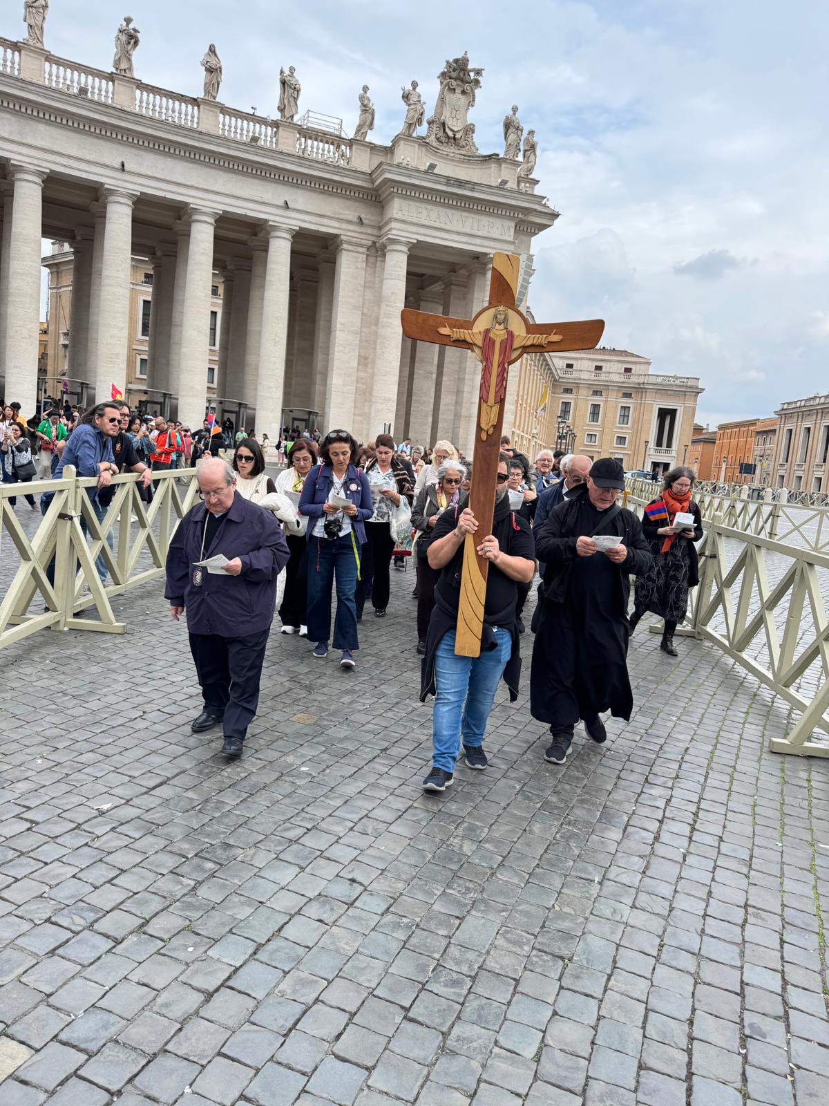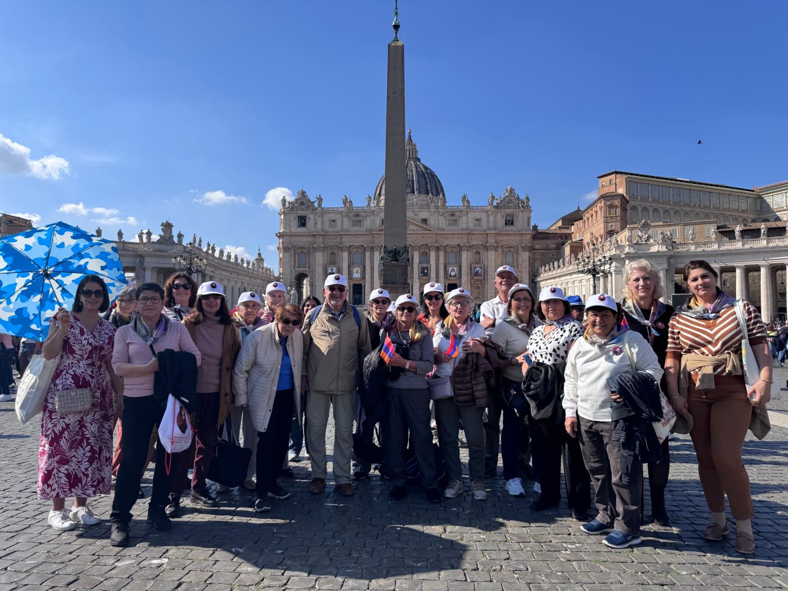 Նոյն օրը կէսօրէ ետք, շարունակելով ուխտագնացութեան յայտագիրը, ֆրանսահայ ուխտագնացները եւս, ինչպէս խումբեր կազմած բազմաթիւ այլ հաւատացեալներ, հաւաքուեցան Վատիկանի Ուխտագնացներու ուղիին վրայ, 2025-ի Կաթողիկէ Յոբելինական տարիին յատուկ Յոյսի ուխտագնացութեան ծրագրին հետեւելու։ Հայ ուխտագնացներ խաչափայտի առաջնորդութեամբ ուղղուեցան դէպի Սուրբ Դուռը, Գերապայծառ Եղիայեանի եւ տէր Պետրոս քահանայի ուղեկցութեամբ, երգեցողութիւններով, աղօթքներով։ Այս առթիւ ընթերցուեցաւ Ս. Պօղոս առաքեալի հովուական նամակը ուղղուած Հռովմէացիներուն (5, 1-5), կատարուեցան սաղմոսերգութիւններ, արտասանուեցաւ «Հաւատամքը»… մինչեւ Ս. Պետրոս տաճարի խորանին առջեւ ներկայանալը։